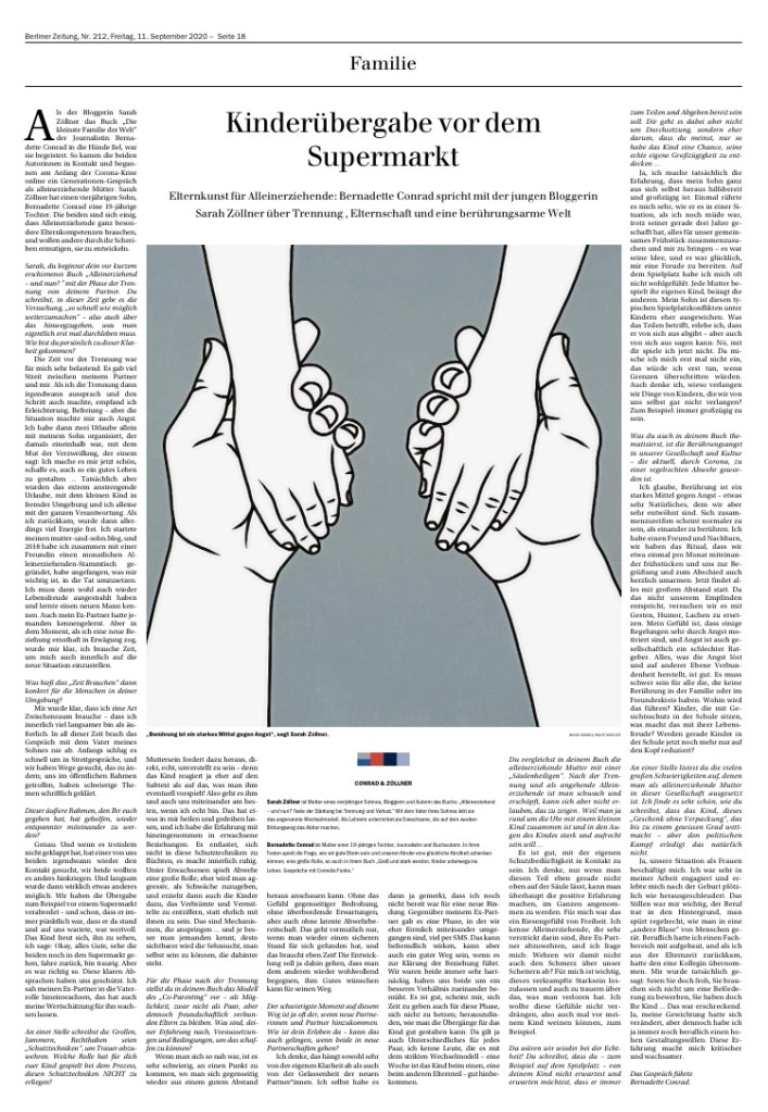 Am 11.09.2020 unterhielt ich mich in der Freitagsausgabe der Berliner Zeitung mit der Journalistin und Buchautorin Bernadette Conrad über die Themen Trennung, Neuorientierung und Elternschaft sowie mein Anfang 2020 erschienenes Buch „Alleinerziehend – und nun?“ Hier im Blog habe ich darüber geschrieben. Zwei Wochen später, am 25.09.2020, folgte der zweite Teil unseres Gesprächs. Diesmal stellte ich als Autorin und Bloggerin Bernadette Conrad Fragen zu ihrem Buch „Die kleinste Familie der Welt“ und zu ihren Erfahrungen als berufstätige, alleinerziehende Mutter einer mittlerweile 19-jährigen Tochter.